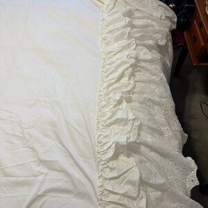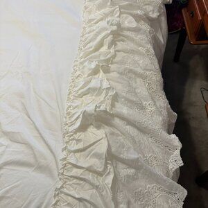 Beige Ruffle Duvet set. Brand new and comes with a storage case. I bought this from a seller on Etsy but unfortunately I like a different set better and they don't accept returns. It's beautiful regardless! I has a nice zipper in the bottom half of the duvet to put an insert in and corner ties on all 4 corners.