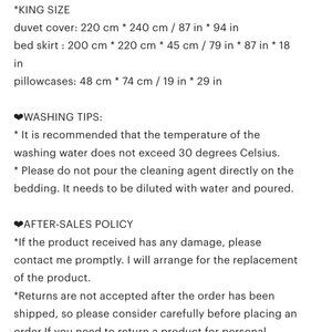 Note that the King size is smaller than a normal US King. I've included a picture of the original Etsy listing (see last photo) that has the dimensions listed. I have a California King duvet insert that fits fine regardless of the size being smaller than usual US King. Definitely has a cotton feel.