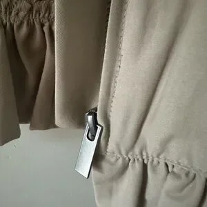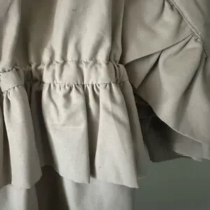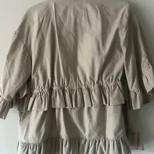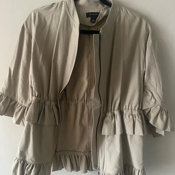 Elegant beige ruffle jacket perfect for any occasion. Features a stylish design with a comfortable fit.