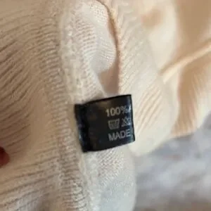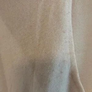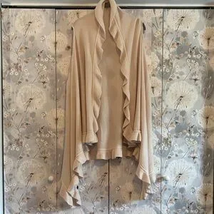 Soft beige open-front cardigan with ruffle trim. Lightweight knit and draped silhouette. Neutral color pairs easily with any outfit.
