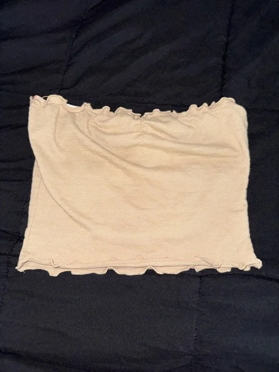 Soft beige tube top with delicate ruffle trim. Stretchy knit fabric for a snug fit. Simple, versatile piece for layering or warm days.