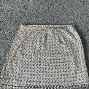 Stylish beige mini skirt adorned with sequins. Perfect for a night out. Super stretchy, just too big on me and is final sale. From vestique !