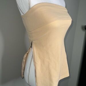 Chic and sleek beige strapless top featuring edgy side zippers and a flattering fit. Perfect for going out or layering under jackets. Worn once and in excellent condition. Size Small.