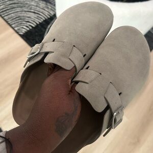 Stylish beige suede clogs featuring a buckle detail. Perfect for casual wear. Never worn!