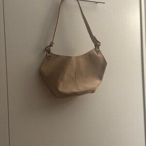 Gorgeous minimalist handbag made from the softest natural beige suede. The leather is smooth, supple, and beautifully structured. Bag is in excellent pre-owned condition with no stains, no marks, and no odors. Clean interior and exterior. Stylish asymmetric shape with sleek stitching and adjustable strap details. Perfect everyday neutral—pairs with everything from casual denim to elevated basics.