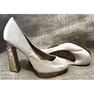 Beige Suede Platform Heels With Gold Glitter Block Heel & Sole Womens Size 6 Sty