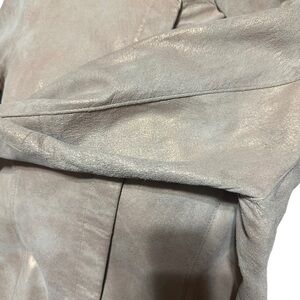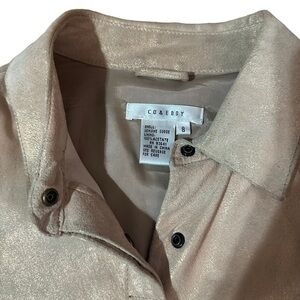 Beige Suede/Gold Snap Down Shirt Size 8 from brand Co & Eddy. Gorgeous gently used condition with light wear in the arm pits and some light straining on the inside as pictured. Super thin gorgeous tan suede with a gold shine to it. Snaps all the way down. Wear layered with a tank and jeans or buttoned up with a mini skirt.