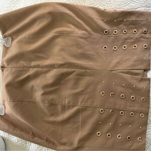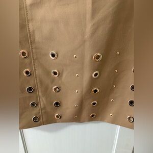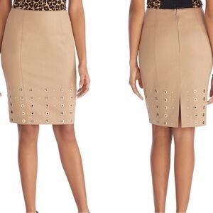 Stylish beige pencil skirt with bold grommet accents. Perfect for a modern, sophisticated look.