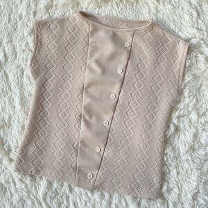 Sleeveless shell top with patterned knit texture and decorative buttons; she’s got that subtle unique vintage charm you’re looking for.
