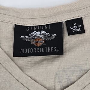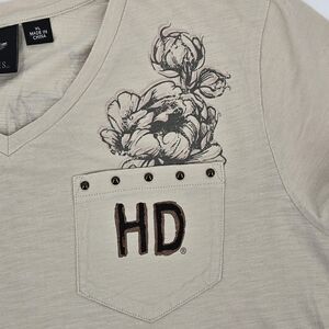 Beige V-Neck Harley Davidson Biker T-Shirt with Floral Pocket Design SZ:XL