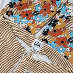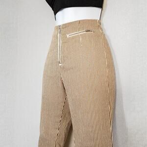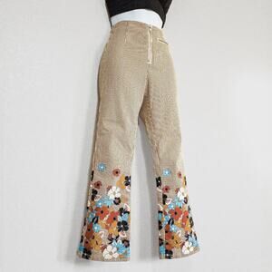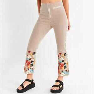 Beige and white striped kick flare cigarette pants with printed colorful flowers on ankles