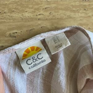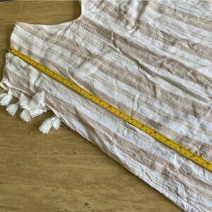 V neck Beige tan white linen coverup mini dress. Nice condition, some loose tassels. Did my best to photograph the loose tassels very pretty great for the beach. Measurements are in the photos.