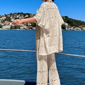 Beige Women's Crochet Knit Cover Up Jacket And Pants Cover-Up Set