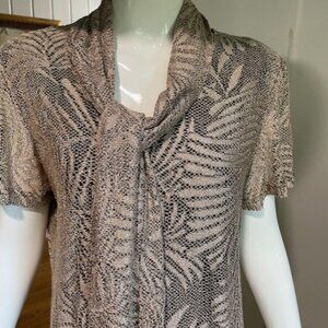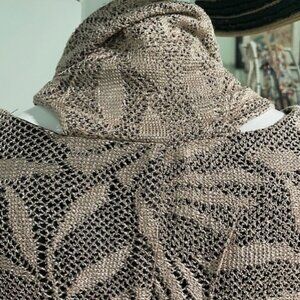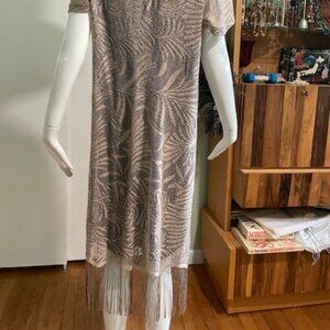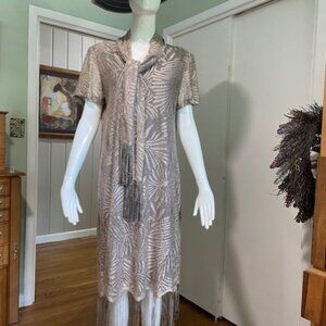 This is a stunning and elegant after 5 dress made of a stretchy shiny beige fabric and lined in black and has short sleeves. It has an attach tie at the back of the neck. It is bordered in Fringe as is the hem of the dress. PTP 20" and it is 38" long not included the fringe.