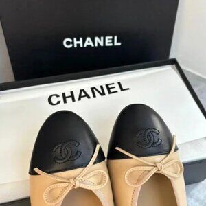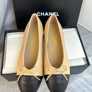 Elegant Chanel ballet flats in beige and black. Perfect for any occasion with a chic design and comfortable fit.
