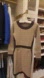 Stylish beige knit dress with brown accents. Long sleeves and elegant design. cozy warm sweater knit, not too heavy. great with high boots. midi length.