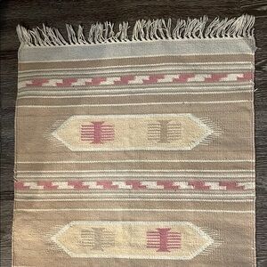 Stylish beige rug with pink geometric patterns. Perfect for adding a touch of elegance to any room.