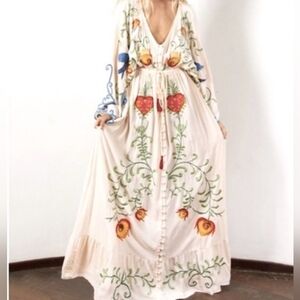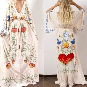 This stunning maxi sundress features a v-neckline and 3/4 bishop sleeves, perfect for a casual resort wear look. The dress showcases a beautiful white base adorned with striking red accents, creating a vibrant and eye-catching design. Its flowing silhouette and artistic print make it an ideal choice for a relaxed yet stylish outing.
