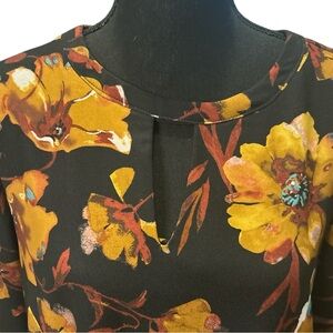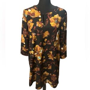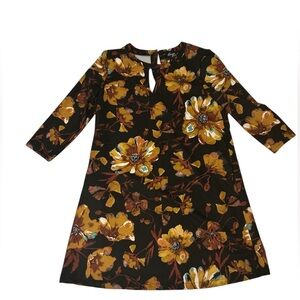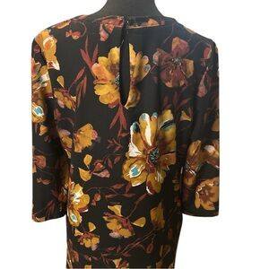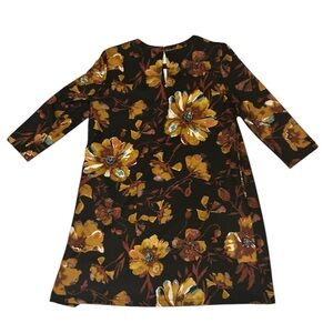 This is a black floral sheath dress Beige by ECI is preowned in like new condition, size S. This dress features a brown floral pattern, 3/4 sleeves with pockets and is made of polyester. It has a knee-length hem and a flower theme, perfect for women looking for a stylish and elegant dress option.