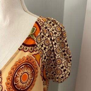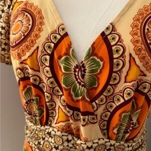 Yellow Body With Orange Green And Brown Geometrical Floral Shapes But Completely Different, Smaller Brown And White Floral Pattern Pattern For The Shoulder & hem