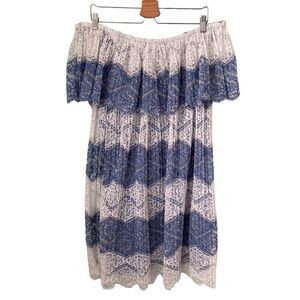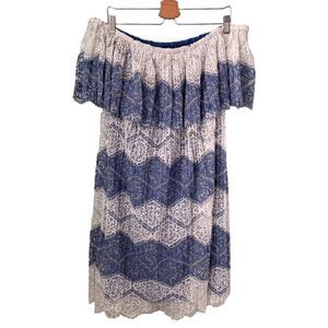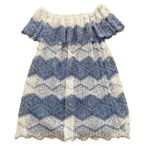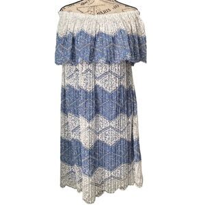 Beige by Eci Off Shoulder Pleated Lace Dress in Blue and White Size Large