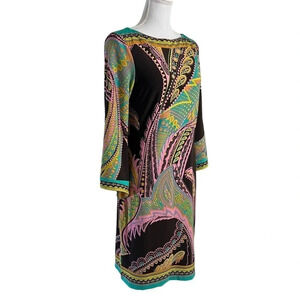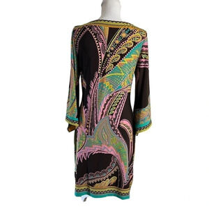 Womens size 4, multicolor, brown, green, pink, paisley, spring, summer, cocktail, party, 3/4 sleeves, jersey, pullover, collarless, made in Vietnam, polyester, spandex, machine washable