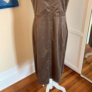 New with tags Beige by eci Faux Suede Dress in taupe. This sheath style dress has faux grommets across the front and at the waist. Back zip closure.