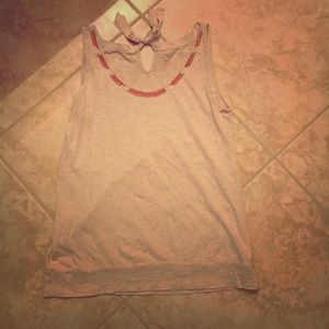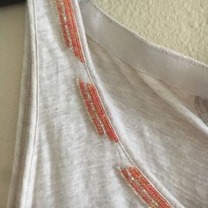 Beige sleeveless top with a tie on the back at the top. Neckline has orange and clear bead accents.