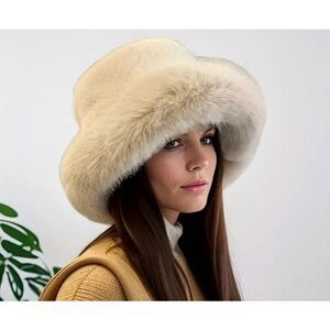 Beige/Light Tan Faux Fur Wide Brim Winter Hat