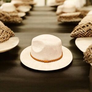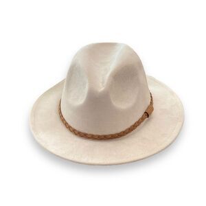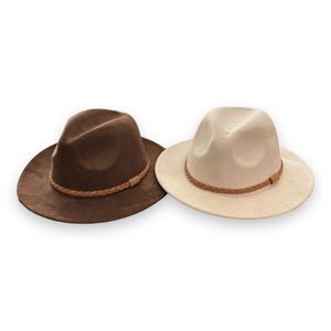 A beige tone western fedora hat with a brown leather braided band, stiff brim with a tall pinched crown for sun protection and daily wear! Rock your ensemble at festival, concert, party, country, bohemian western, party, festival hat! Great style for men or women!