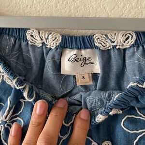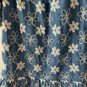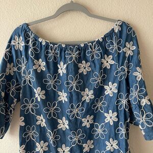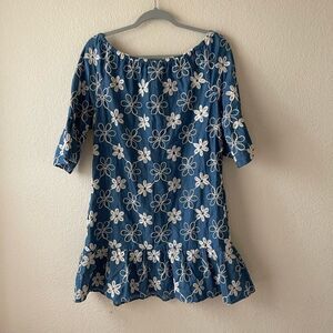 Floral embroidered chambray mini dress. Shift style. Off the shoulders no flaws. Size 8.