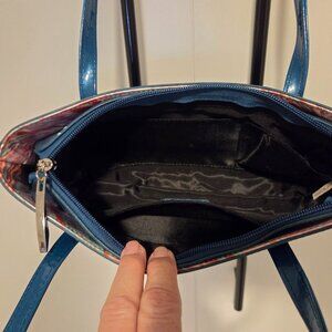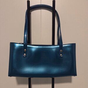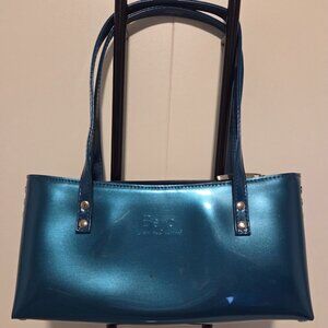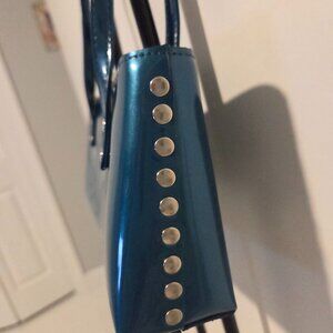 This is a Beijo, London, Paris, NY bag. Measures 10x5. It has double handles with an 8 inch drop, silver studs on each side, where the handles attach and on the bottom. Zip closure, 2 slip pockets inside and 1 zip pocket. A shiny deep turquoise color. One flaw as seen in the last photo-there is a tiny brown dot on the front, not noticeable. A VERY COOL purse!!!!!!