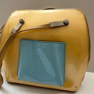 Chic Beijo bag with a glossy yellow finish. Features a bold blue front pocket. Ideal for a stylish look.