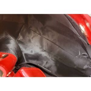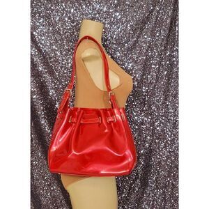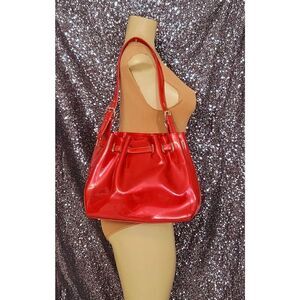 Red patent leather shoulder bucket bag with cinch closure. 16 x 12 x 6