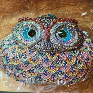 Bejeweled Owl Fancy Dinner Bag - Multi Colored Gemstone Owls Face - New Silk Box - Multi Colored Jeweled Owls Face dinner bag with a chain and extra jewels - No tags or price however it comes in a silk box never used - My Mom collected these types of bags and definitely a conversion piece - the styrofoam insert is to protect the silk pouch inside bag - * Perfect for this time of year
