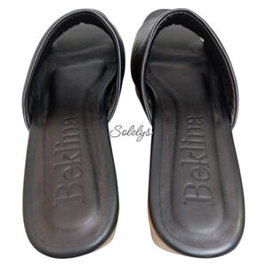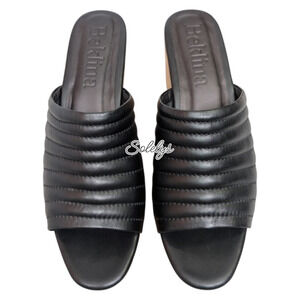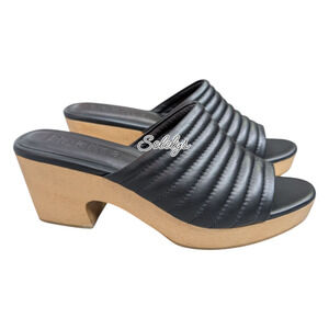 Beklina Ribbed Black Leather Open Toe Wooden Platform Clogs Mules Womens 10