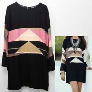 The Bel Kazan Sahara Dress from the Baraka Collection captures Moroccan-inspired artistry in a modern silhouette. Featuring bold geometric patterns in shades of pink, tan, and cream against a black base, this dress is both statement-making and versatile. Designed with long bell sleeves, a round neckline, and a mini length cut for effortless day-to-night styling.