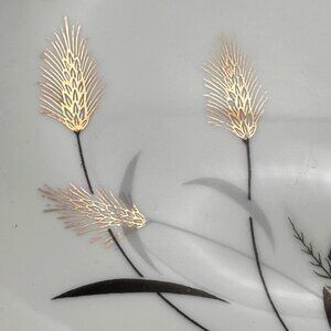 This vintage Bel-Air China tea cup, saucer, and plate/bowl trio showcases an elegant wheat design adorned with gold trim. Crafted in Japan, this set exudes timeless sophistication, ideal for connoisseurs of fine china. The intricate pattern adds a touch of nostalgia, evoking images of graceful afternoon tea settings from yesteryears.