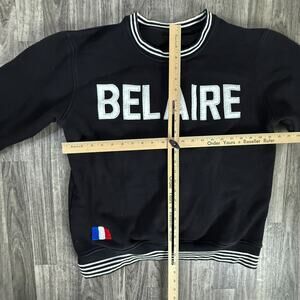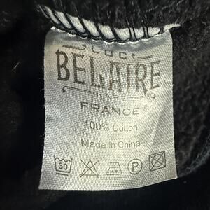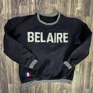 This is a Belaire France black crewneck sweatshirt with ribbed collar, cuffs, and hem featuring contrasting stripe trim. The front displays “BELAIRE” in large lettering across the chest, and there is a French flag motif accent at the bottom. Made of 100% cotton (tag reads “100% Coton, Made in China”). The interior has soft fleece lining. The garment is versatile, stylish, and great for streetwear, casual, or layering. Please see photos for close-up of fabric, condition, and stitching.