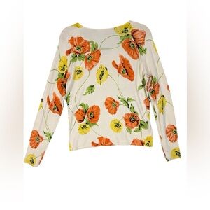 Beautiful vibrant silk blend sweater featuring poppy flowers v neck perfect for spring and summer