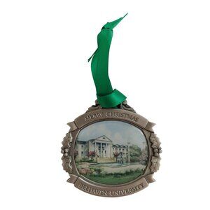 Metal Belhaven University Merry Christmas ornament featuring a picture facing Fitzhugh Hall across the fountain
