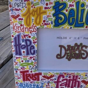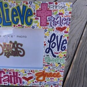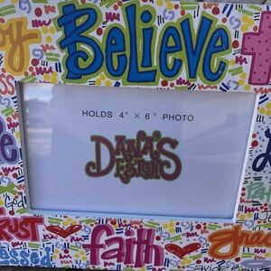 This is an adorable picture frame filled with inspirational words. It holds a 4x6 photo. The overall dimensions are 9.25” x 7.25”