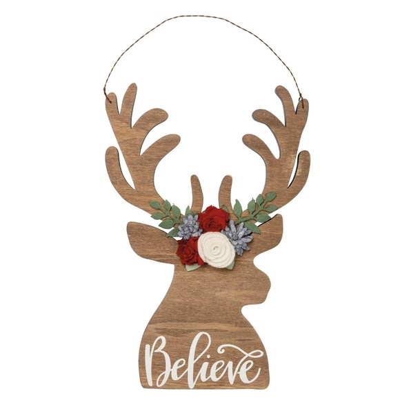 Perfectly unique for Christmas, a wooden stag-shaped wall decor piece featuring a hand lettered "Believe" and felt flower additions. Contains top twisted wire loop for easy hanging.
