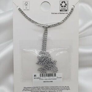 This is a brand new bold statement necklace featuring a detailed, fierce Lion Head pendant approximately 2 inches long by 1 inch wide crafted from durable Stainless Steel and hung on a 24 inch long curb chain with lobster claw clasp closure.