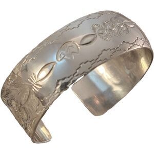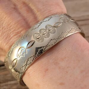 Beautiful artisan Belinda Woody sterling silver Navajo Native American stamped pattern wide cuff with synclastic shaping. This a great staple Native American "no stone" piece for your collection!