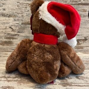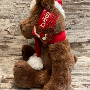 The Belkie Bear from 2011 is a charming holiday-themed plush bear. It has a warm brown fur color and is adorned with a festive red Santa hat trimmed with white fur. The bear is also wearing a red scarf with white pom-poms at the ends, adding to its Christmas cheer. Its paws are embroidered, with "Belkie" on the right paw and "2011" on the left paw, marking the year of this special edition. The bear's expressive eyes and friendly smile make it an adorable addition to any holiday collection.