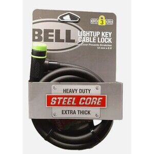 Secure your bicycle with the Bell Bicycle Lock featuring a light-up key and cable lock. This heavy-duty lock is made of steel and has a 6'x12mm size. The lock mechanism is keyed and the color is black with green accents. The Bell Cable Lock is suitable for security level 3 and is perfect for cycling enthusiasts. The lock is manufactured by Bell and does not come with any custom bundle. Get your hands on this durable lock and keep your bicycle safe and secure.