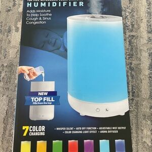 Top fill ultrasonic humidifier with color changing feature. Adds moisture to soothe cough and sinus congestion. Includes aroma diffuser with essential oils.