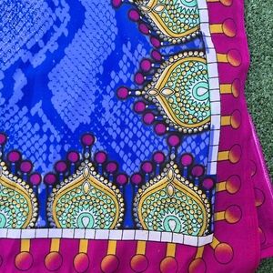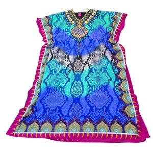 Bring vibrant energy to your wardrobe with this beautiful kaftan dress by Bell Pepper. Designed in a flowing silhouette, it features a striking mix of blue, green, pink, and gold hues, accented with tiny gold studs that add a subtle shimmer. A unique black and white snake-print design at the waist area creates a flattering visual contrast.