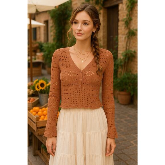 Bell Sleeve Crochet Boho Festival Fairy Hippie Cottage core Top Brown Women’s XS